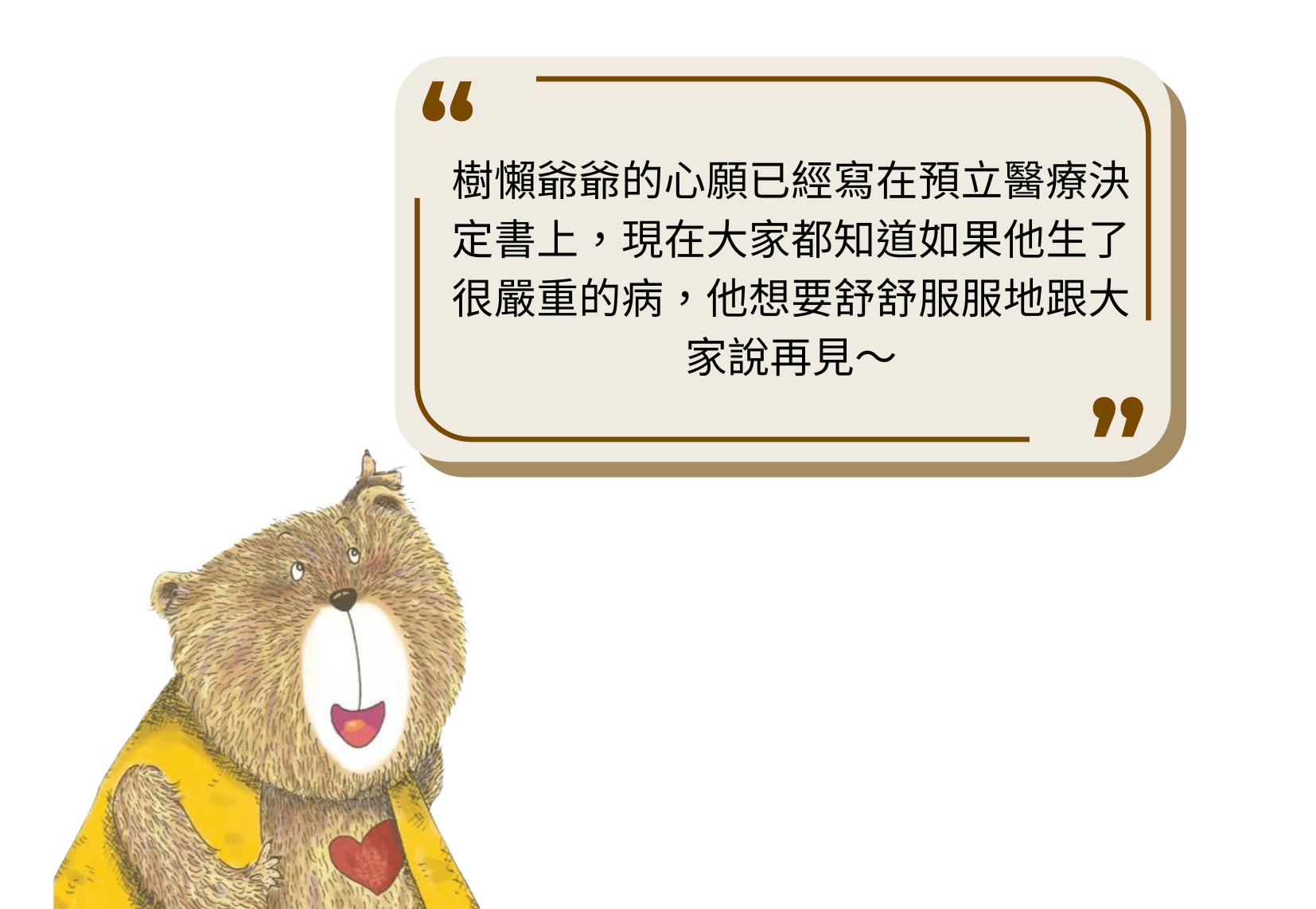 樹懶爺爺的心願 樹懶爺爺和牛爺爺每天帶著大家一起做運動 有一天,牛爺爺忽然暈倒了,只能躺在醫院裡,再也不能跟大家一起說說話,做運動了... 樹懶爺爺知道牛爺爺不喜歡這樣,樹懶爺爺也不喜歡,可是樹懶爺爺能怎麼做呢? 狐狸姐姐建議樹懶爺爺把自己的心願寫下來, 將來生病的時候,森林裡的好朋友跟醫生伯伯就會知道你的心願了! 樹懶爺爺放心了,小麥熊說:「樹懶爺爺,您的心願我們一定會幫您實現的! 但是您也要健健康康的繼續跟我們一起做運動呵!」